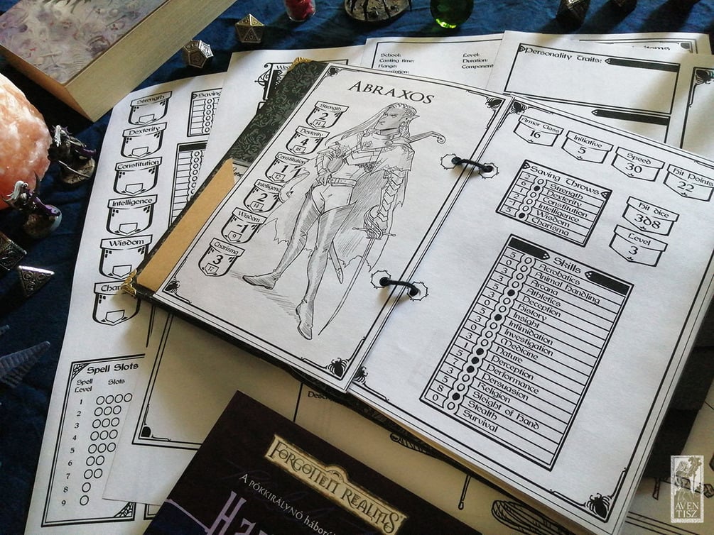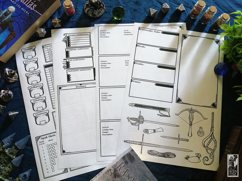 The greatest thing about this modular character sheet is that you can rearrange it, stick any picture or notes next to them, and it comes with a couple underdark-inspired item art! There are also a couple borders and boxes left empy, for any resource your character has (like sorcery points, magic item charges, etc...). For the magic users, the sheet comes with spell card templates as well!
